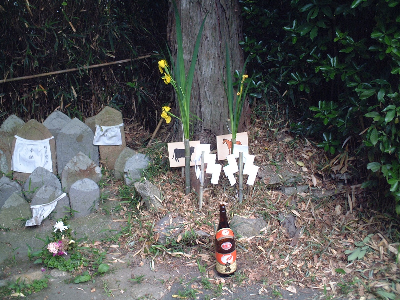 行事:当番が前日までに絵馬と花立、御幣を作り、お供えものを準備しておく。準備は20㎝四方の板に牛(右向き)と馬(左向き)を書いた板を竹に結び付け、向かい合わせに立て、御幣、蓬とショウブを竹の花入れに飾り、お神酒とお菓子を供える。